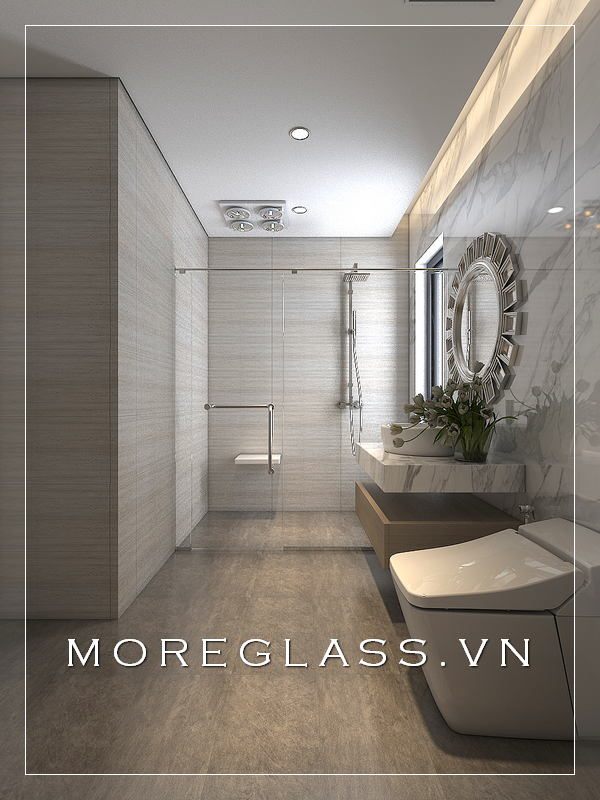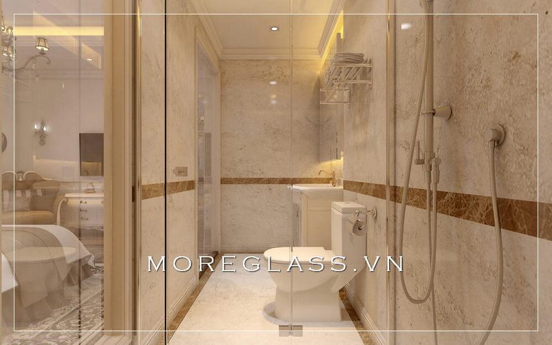 Hệ thống kính ngăn hiện đại được sử dụng trong không gian phòng tắm rộng của biệt thự, nhà phố thêm hiện đại, tiện nghi.