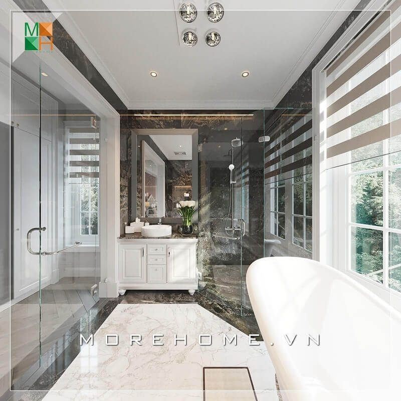 Với mẫu phòng tắm có diện tích lớn có thể thiết kế vách tắm bằng kính cường lực để chia thành các khu vực như khu vực tắm đứng, khu vực vệ sinh, khu vực tắm bồn và khu tủ lavabo, vừa giúp ngăn nước và giữ sàn khô ráo mà vẫn có sự liên kết trong không gian phòng tắm