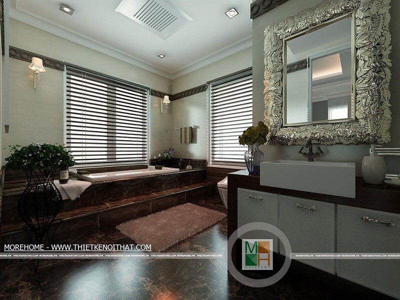 Thiết kế phòng tắm sử dụng vách ngăn bằng kính cao cấp, giúp phân chia khu vực giữa phòng ngủ và phòng tắm mà vẫn mang vẻ đẹp hiện đại sang trọng, phù hợp cho biệt thự có diện tích phòng ngủ rộng