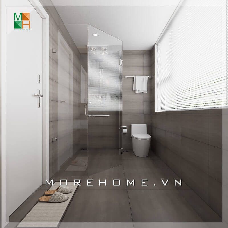 Vách tắm kính ngăn giữa 2 khu vực tắm đứng và vệ sinh tránh bắn nước gây ẩm ướt khó chịu tạo sự thông thoáng cho căn phòng.