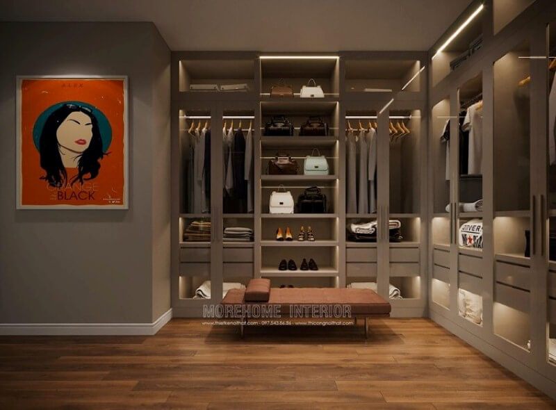 Thiết kế phòng thay đồ mở phong cách hiện đại với ý tưởng sử dụng tủ quần áo cửa kính cường lực trong suốt sẽ giúp bạn chọn đồ một cách nhanh chóng.