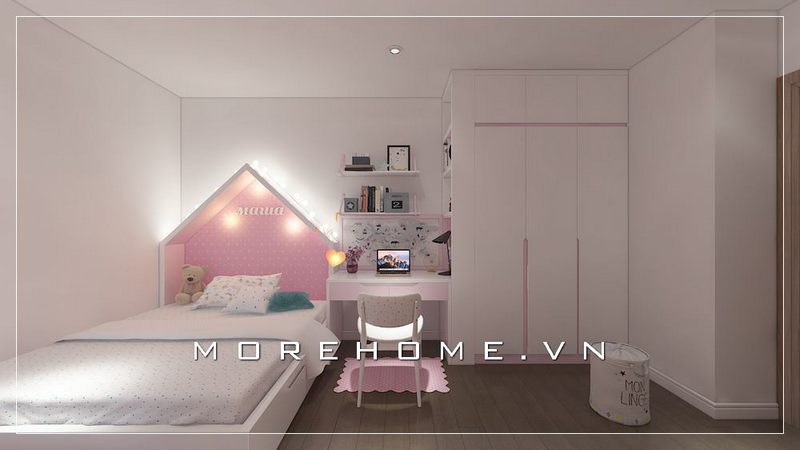 Thiết kế tủ quần áo hiện đại kịch trần kết hợp bàn học, kệ sách đa năng mang đến cho bé gái một không gian học tập nghỉ ngơi thoải mái nhất