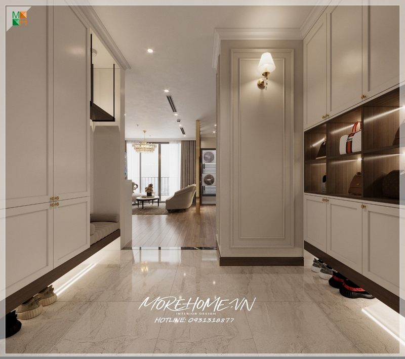 Tủ giày gỗ tự nhiên màu trắng chia ngăn hiện đại vừa là nơi cất đồ dùng cho gia chủ mà còn trưng bày những món đồ có giá trị đẹp mắt cho không gian ngôi nhà và đem lại sự thoải mái cho chủ nhân