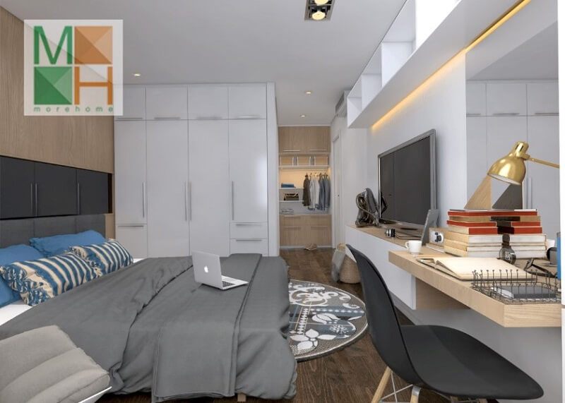 Thiết kế nội thất chung cư với phòng ngủ con hiện đại, gỗ công nghiệp được sử dụng cho không gian phòng ngủ này, từ chiếc giường đến tủ áo, bàn học,..