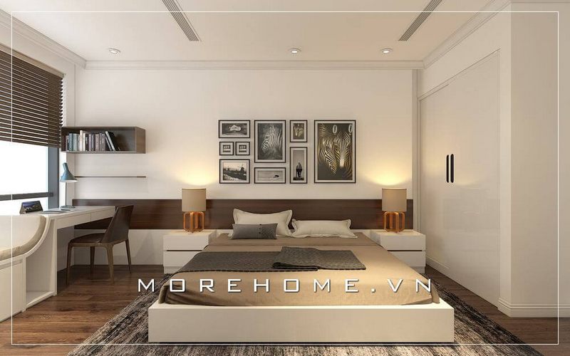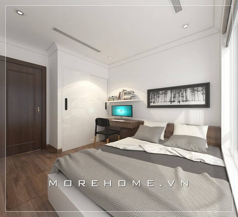 Sự kết hợp hài hòa giữa tủ áo gỗ công nghiệp, giường, bàn học cùng chất liệu và tone màu mang đến một không gian nghỉ ngơi đầy sang trọng và tiện nghi
