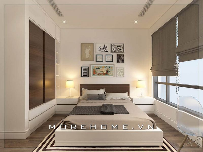 Tủ quần áo màu trắng được lựa chọn mang lại cảm giác tinh tế và liền mạch, thoáng đãng hơn cho không gian phòng ngủ nhỏ
