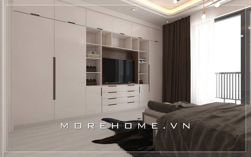 Thiết kế tủ áo thông minh, vừa là tủ quần áo, vừa là kệ tivi, giải pháp tiết kiệm không gian cho phòng ngủ chung cư