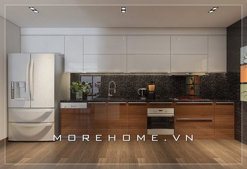 Mẫu tủ bếp gỗ công nghiệp hiện đại, thiết kế chữ i đặt ở vách tường giúp tiết kiệm được diện tích sử dụng của ngôi nhà