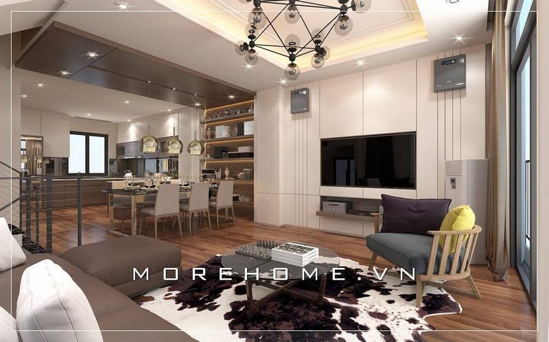 Thiết kế bàn ăn gỗ công nghiệp liền kề với phòng khách, không hề có vách ngăn tạo độ mở và liền mạch cho không gian.