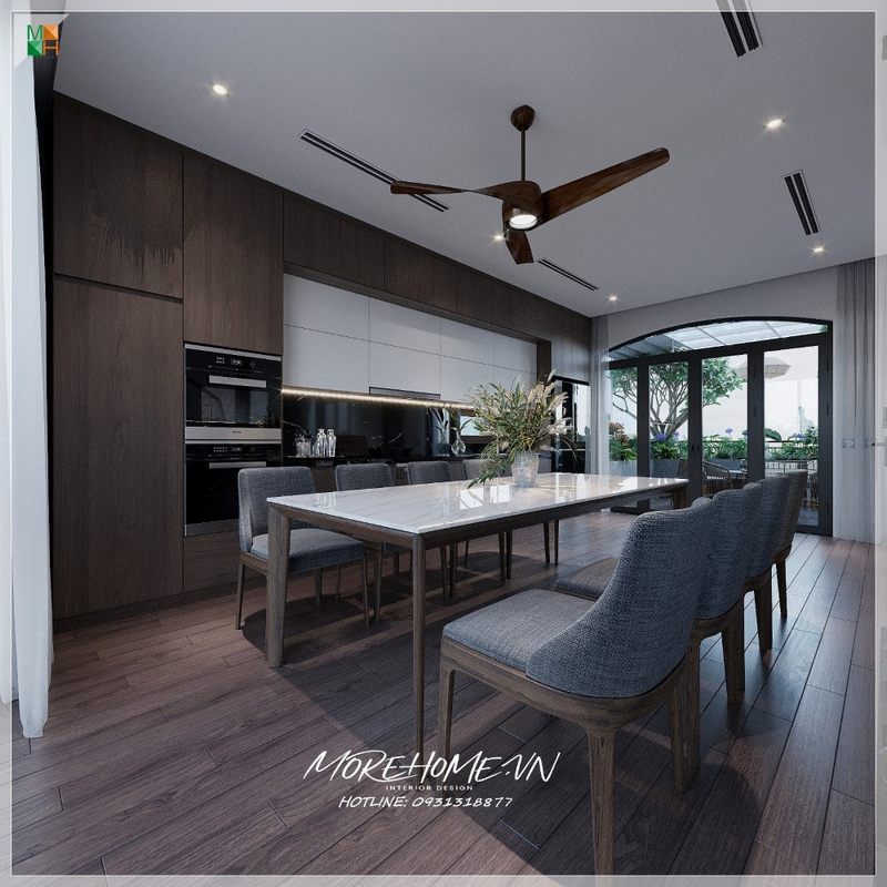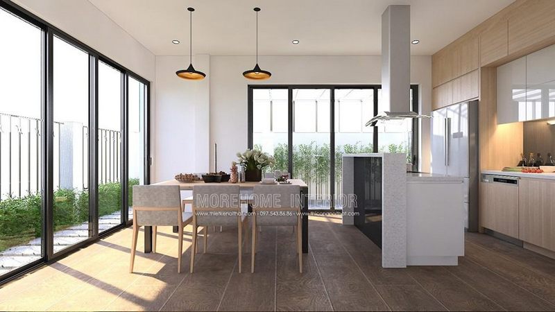 Cửa kính lớn được bố trí nơi phòng ăn rộng của biệt thự, nhà phố càng làm không gian thêm thoáng đãng tràn ngập ánh sáng tự nhiên.