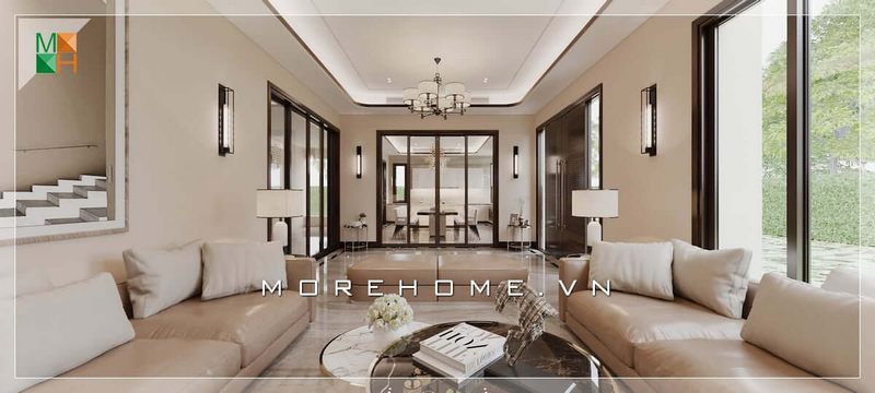 Sự hiện đại của không gian phòng khách nhờ một phần vào sự có mặt của các mẫu cửa kính thông thoáng làm tăng độ tiện nghi cho không gian nơi đây.