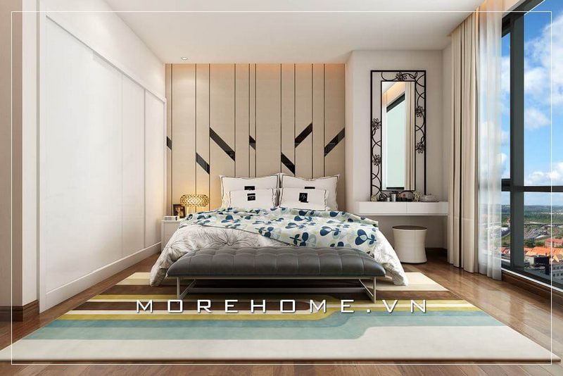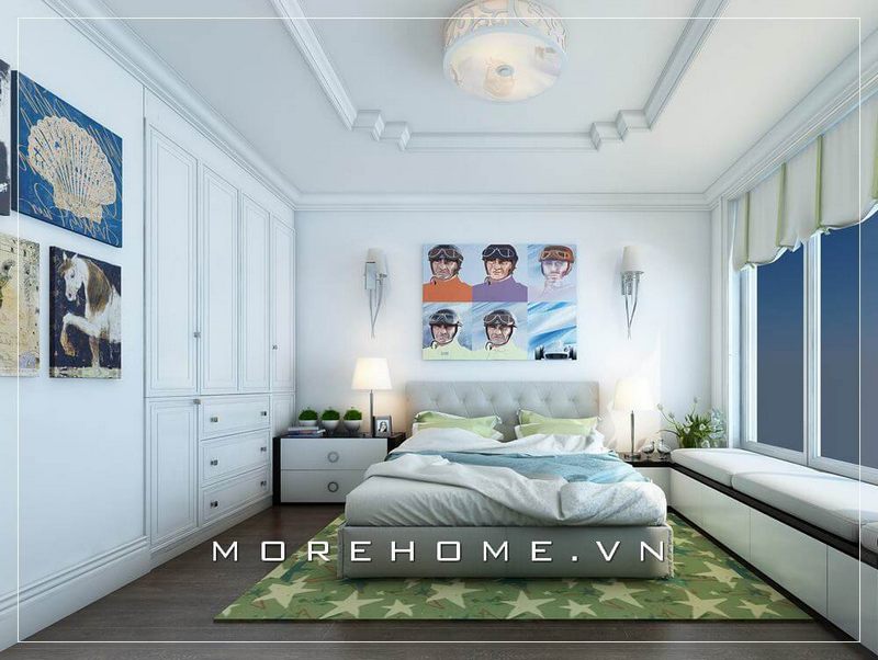 Lựa chọn tone màu trắng chủ đạo, giường ngủ gỗ công nghiệp tạo cảm giác thoáng hơn cho căn hộ chung cư, nhà phố có diện tích nhỏ