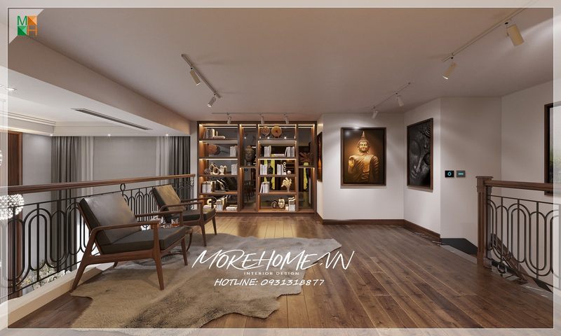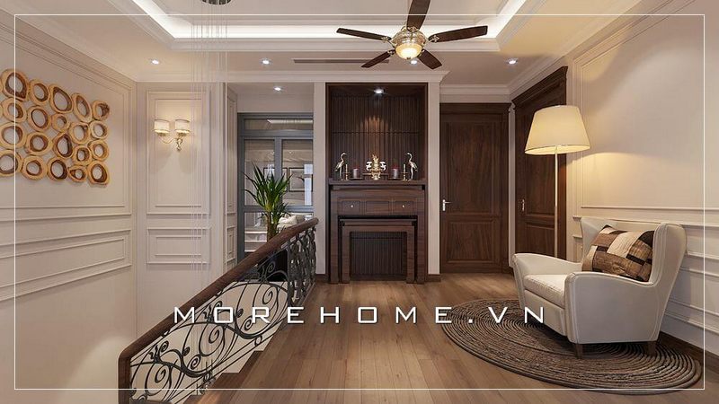 Với không gian phòng thờ yên tĩnh trang nghiêm và có diện tích rộng, gia chủ có thể bố trí thêm bộ bàn ghế và tủ sách để có thể thư giãn đọc sách mỗi cuối tuần