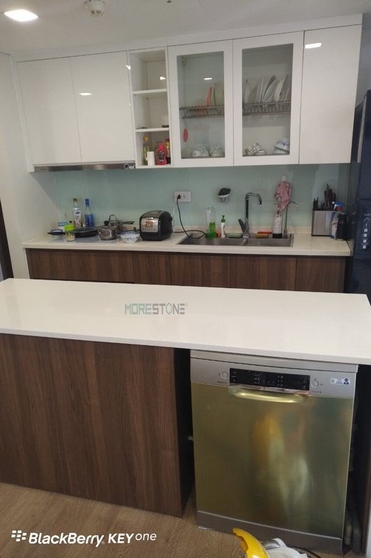 Bàn đảo bếp gỗ tự nhiên, mặt bàn ốp đá màu trắng cao cấp tạo nên không gian bếp tiện nghi cho người nội trợ