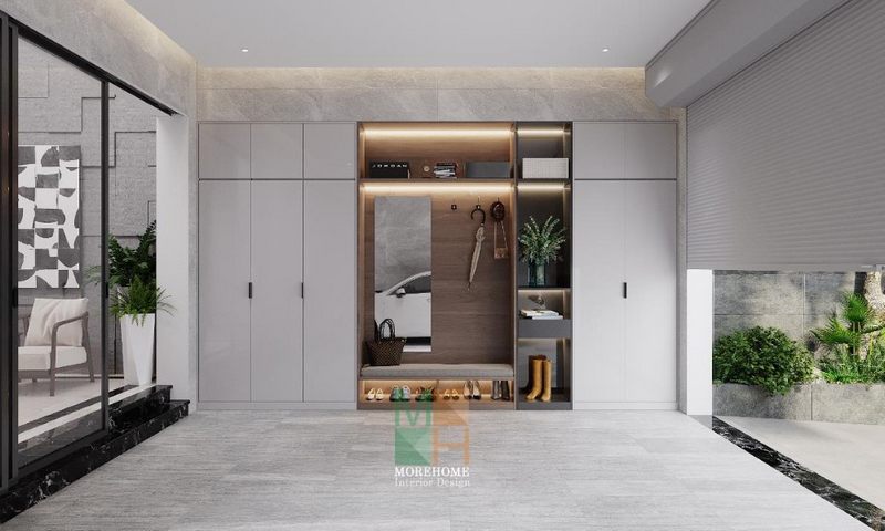 Thiết kế tủ quần áo hiện đại màu trắng, kệ để đồ âm tường kịch trần sáng tạo, tiết kiếm được tối ưu diện tích không gian vừa có tính thẩm mỹ.