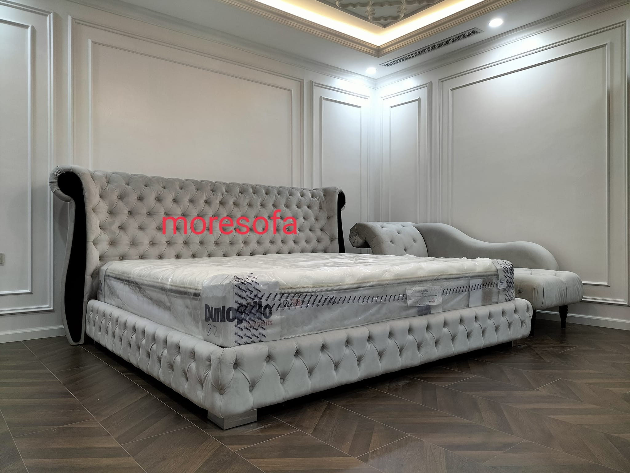 Ngọt ngào và sang chảnh với mẫu giường ngủ tân cổ điển bọc vải khung gỗ óc chó cao cấp này