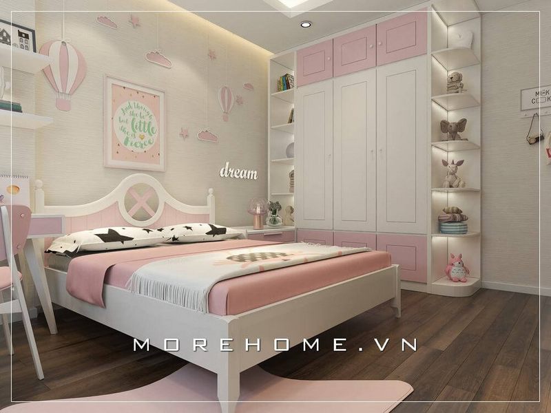Mẫu thiết kế nội thất phòng ngủ bé gái đầy dễ thương và độc đáo, giúp không gian trở nên hấp dẫn hơn bằng chiếc giường ngủ cách điệu.